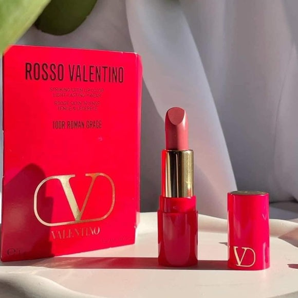 Rosso Valentino is a highly pigmented refillable lipstick that delivers pure vibrant color in one stroke. Available in 34 shades in two exquisite finishes: creamy vibrant satin and non-drying luminous matte.he satin formula features a new patented technology that encapsulates a liquid lipstick into a stick. A thin color film that instantly glides onto lips for an intense pay-off in one stroke. The lightweight satin formula is infused with 70% caring ingredients that gives all day moisture and comfort for instant and over-time smoother, fuller and bouncier lips.