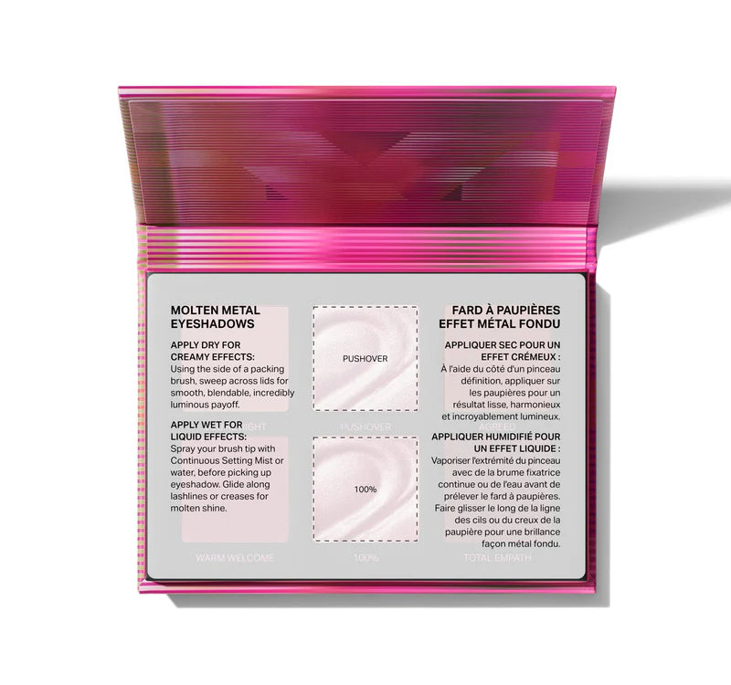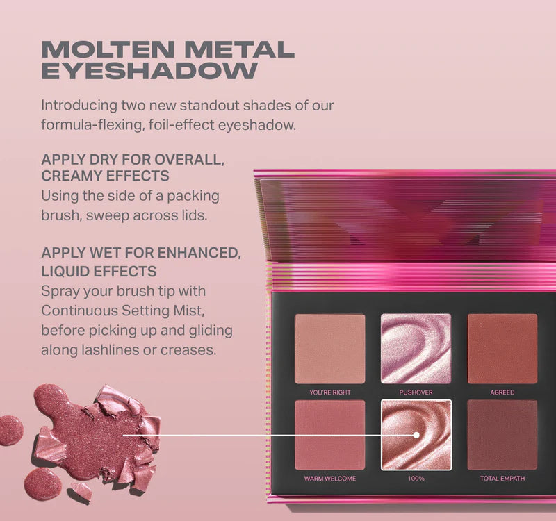 Attract an audience with this tonal curation of richly pigmented soft pink and copper shades, featuring 2 Molten Metal Eyeshadows—that can be applied wet or dry—plus 4 complementary matte shadows for melodramatic, multidimensional effects.
