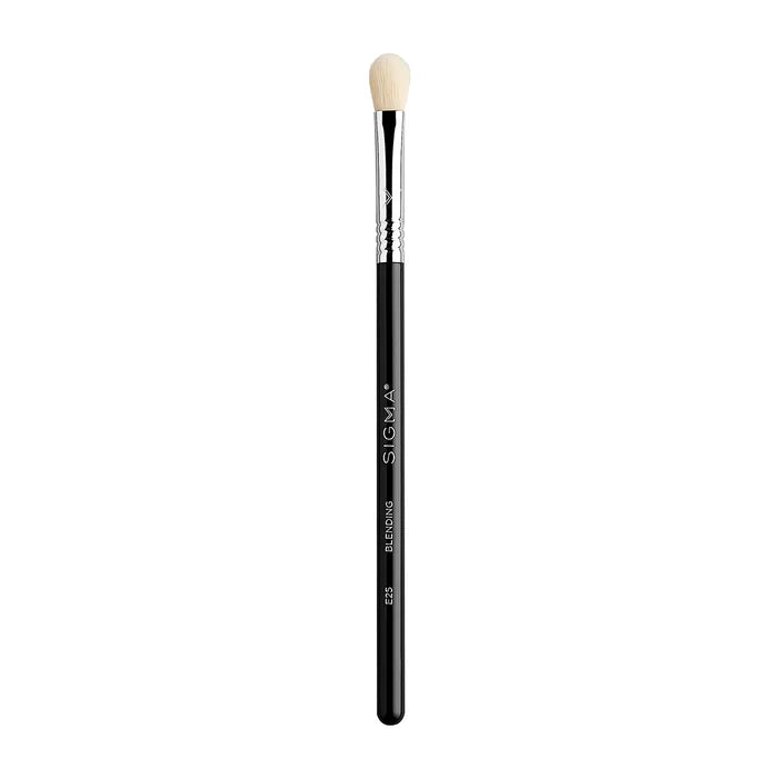 Featuring a flattened ferrule brush head, use the E25 Blending for patting down shimmer or matte eyeshadow directly onto the lid. Then, use the fluffy tip to blend it out.
