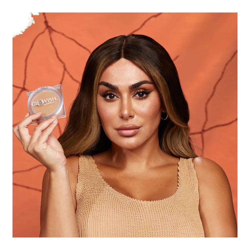 Dimensional Radiance: After application of our GloWish Multidew Skin Tint, set with the powder to add extra dimension.
