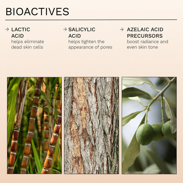 Powerful, yet gentle enough for daily use and designed to limit irritation, the energising formula helps smooth skin texture, evens out skin tone, visibly tightens pores and minimizes the appearance of fine lines and pigmentation, leaving your skin instantly dewy and glowing. With smoothing Lactic Acid (AHA) from sugar cane, pore refining Salicin (BHA) from Willow Bark and radiance boosting Azelaic Acid Precursors from Olives.