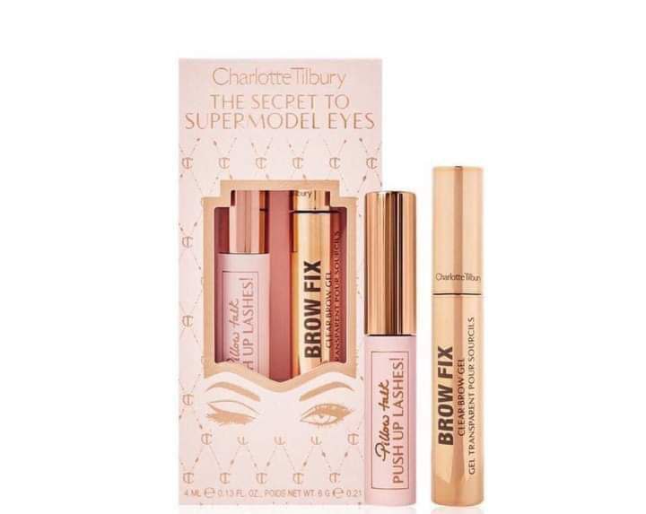 Charlotte Tilbury The Secret To Supermodel Eyes. Set includes Pillow Talk Push Up Lashes - Super Black and Brow Fix - Clear Brown Gel.
